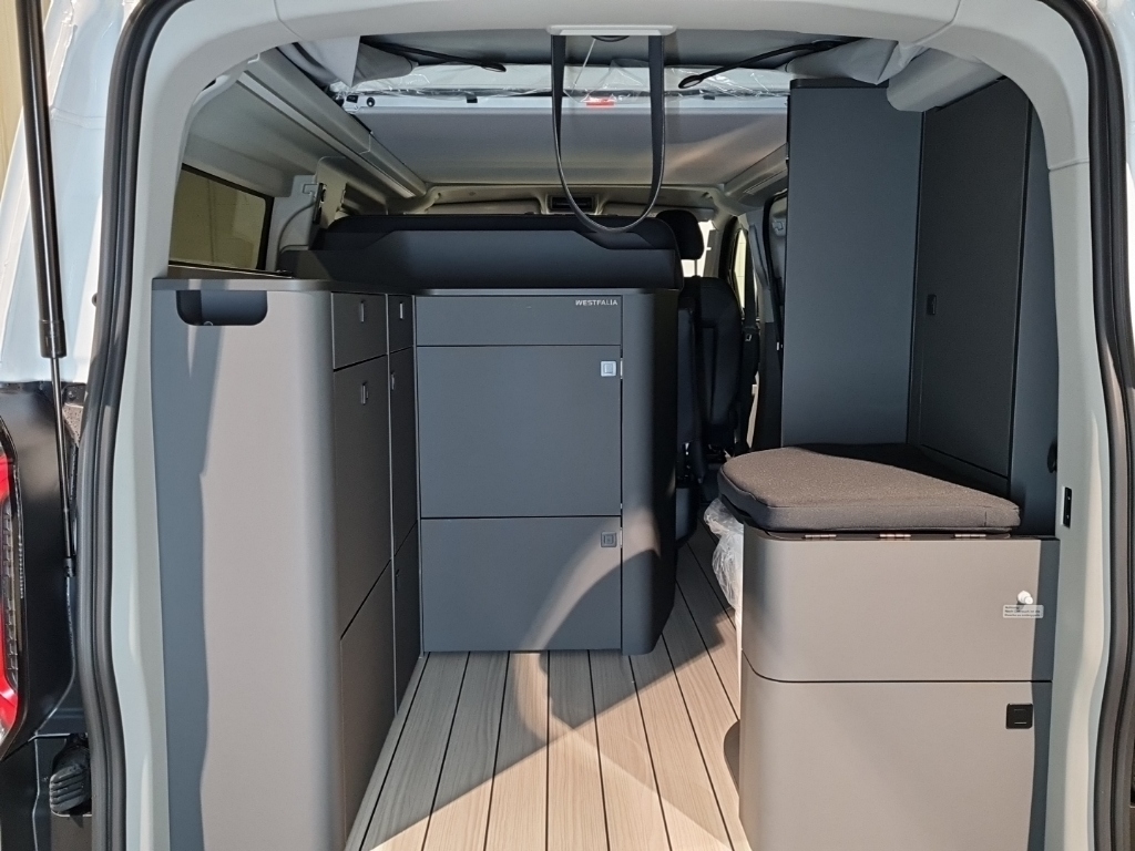 Standheizung, Lenkrad beheizbar, Dachbett 1250 mm x 2050 mm, Kühlschublade (33 Liter), 2 Flammen-Kochfeld mit entnehmbarem Topfgestell und integrierter Spüle (Warm- und Kaltwasser Funktion), Warmwasserboiler mit Außendusche im Heckbereich (Warm- und Kaltwasser Funktion), Innentisch (an Seitenwand befestigt, verschiebar, wegklappbar), Heckklappen-Picknickleuchte mit An/Aus-Funktion, Outdoor Campingtisch (in der Schiebetür verstaut), 2 Campingstühle (in der Heckklappe verstaut), 2-Zonen-Klimaautomatik (mit automatischer Temperaturkontrolle, Fahrer- und Beifahrerseite getrennt regelbar), Teppich-Fußmatten vorn, Ausstellfenster 2. Reihe rechts und links in den Seitenscheiben, schmaler Kleiderschrank mit Einbautoilette